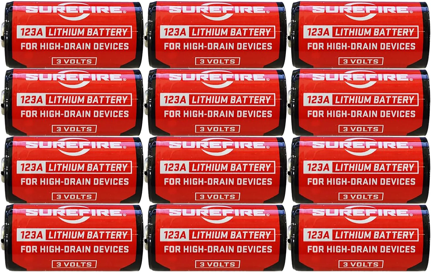 SureFire SF12ABBCS 123A Batteries Red/Black 3.0 Volts 1,550 mAh (12) Single Package Clamshell