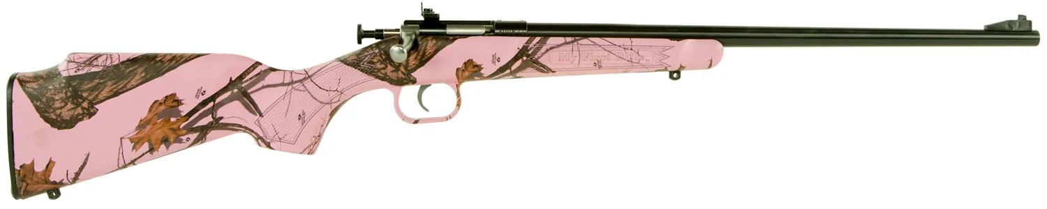 Crickett’s Single Shot 22 LR rifle features a Mossy Oak Pink Blaze synthetic stock, adjustable rear sight, and a bolt action constructed from alloy nickel plated steel.